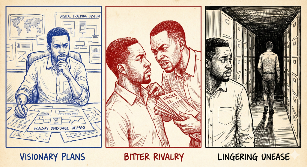 Leaving the office, Kwesi felt the weight of the impending changes settling on his shoulders. It was a good weight, the burden of responsibility he had always craved. He walked back towards his desk, his mind already racing with plans—digitising the tracking system, renegotiating insurance rates, perhaps even expanding their fleet.