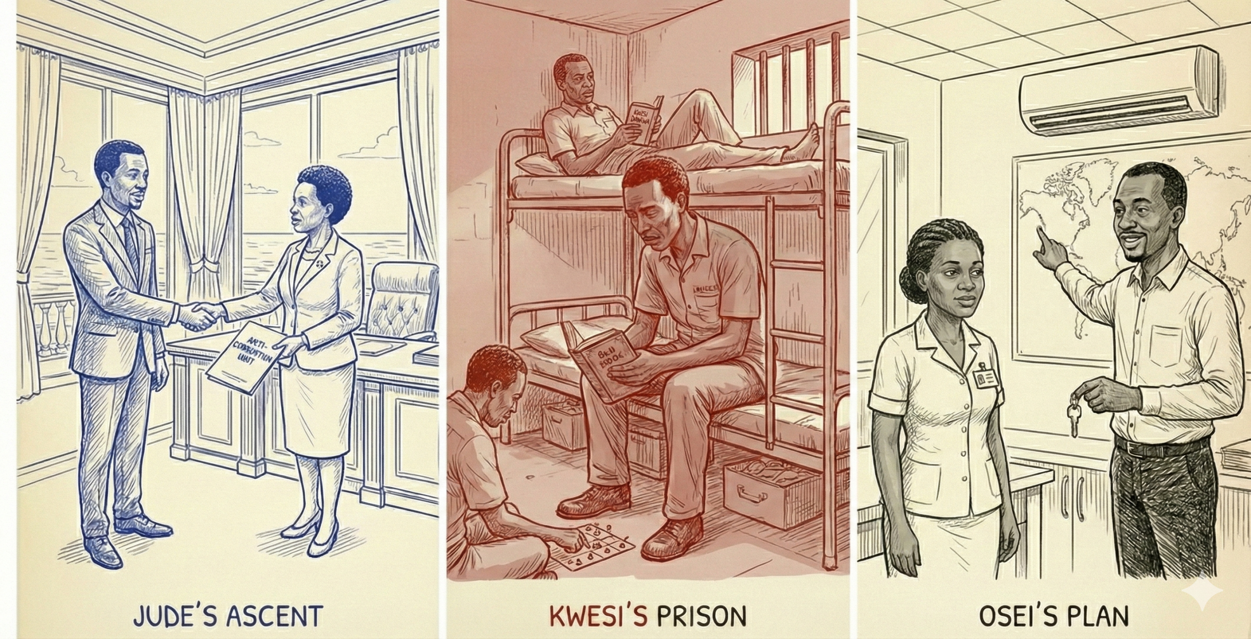The journey took six hours, the car winding through the hills and the valleys. Osei talked incessantly, about the harbour, his new job, the important people he was meeting. Abena mostly watched the landscape blur past, her mind already inside the walls of the ACP.