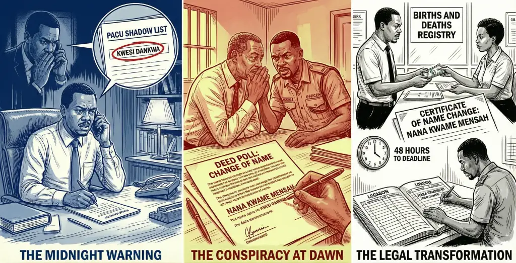 “It won’t be a phantom,” Kwarteng interrupted. “It will be a legal reality. Every citizen, even a prisoner, has the right to a change of name by deed poll. I can have the papers ready by noon. I have a contact at the Births and Deaths Registry who informs me that if we pay for express service, the filing and name change can be completed in less than 24 hours. By tomorrow morning, it will be official. Kwesi Dankwa will legally cease to exist, replaced by Nana Kwame Mensah.”