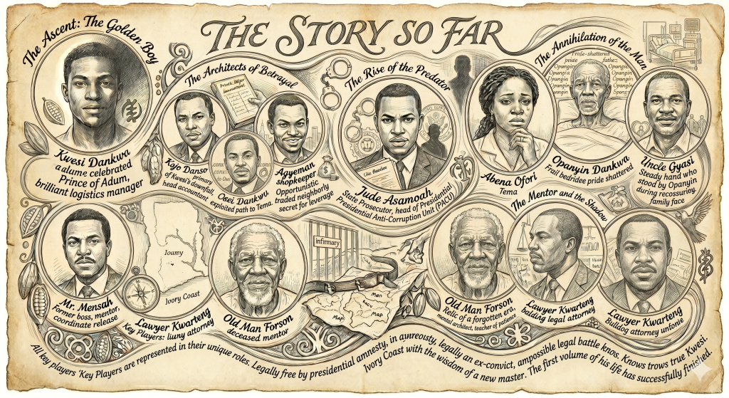 The end of the decade brought an unexpected shift. Global pressure regarding prison overcrowding forced the state to grant a Presidential Amnesty. To ensure Kwesi wasn’t blocked by Jude Asamoah’s long reach at the PACU, his lawyer, Kwarteng, and his former boss, Mr. Mensah, orchestrated a last-minute legal name change. Kwesi Dankwa was officially erased, and a man named Nana Kwame Mensah was added to the release list and evading Jude’s surveillance.