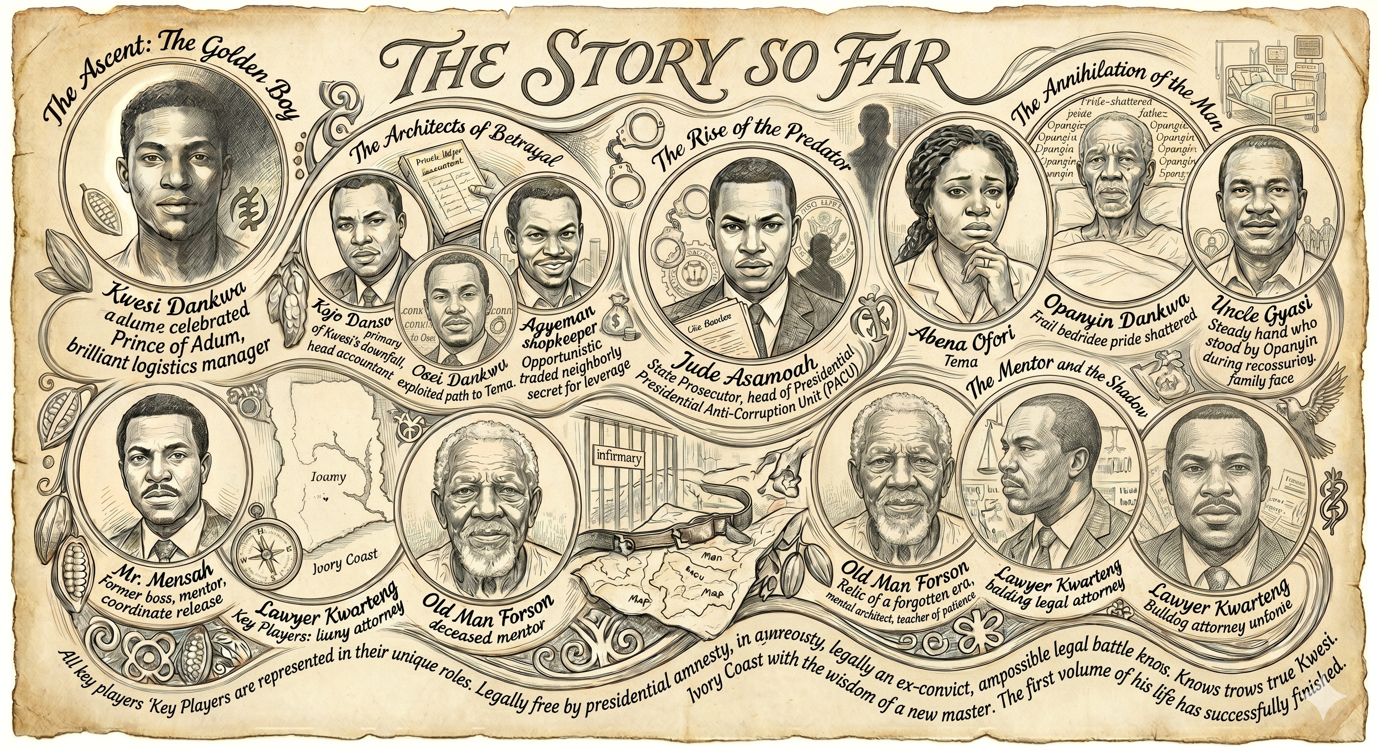 Mr. Mensah: Kwesi’s former boss and mentor at Ashanti Cocoa Company. He sacrificed his own career and savings to defend Kwesi, eventually helping to coordinate his secret release and journey to Ivory Coast.
